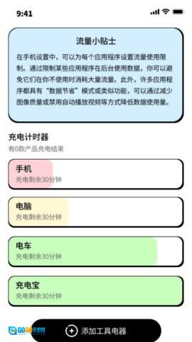 小可鸭充电精灵是一款操作简便、使用便捷的充电管理工具类软件。借助该软件,你能够添加并管理各类需要充电的电器产品,而且软件会以直观清晰的方式,将各种电器设备的充电剩余时间呈现出来,从而让用户清晰地知晓每个电器设备的充电剩余时长。