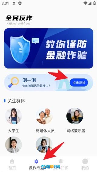 3. 在「反诈专题」页面,点击“点击测试”按钮,即可进入风险测试系统,对自身的防范能力进行初步判断。