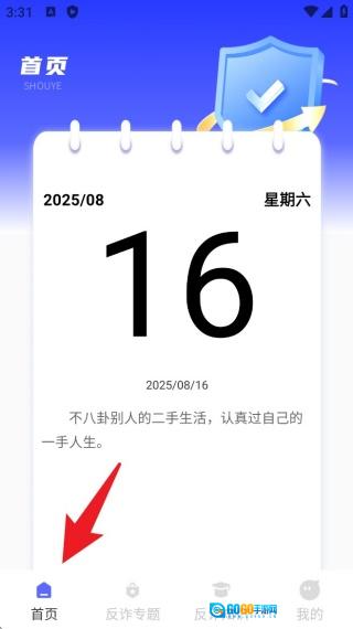 1. 打开App,默认显示「首页」界面,在此页面能够看到当日日期以及提醒语录,助力培养每日关注安全的习惯。