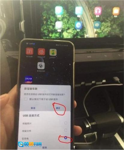 2、开启手机上的新宝骏应用,使用数据线将手机与车机相连,选中“默认情况下用于该USB配件”的方框,接着点击“确定”。在后续弹出的USB连接方式提示框里,选择仅充电选项。