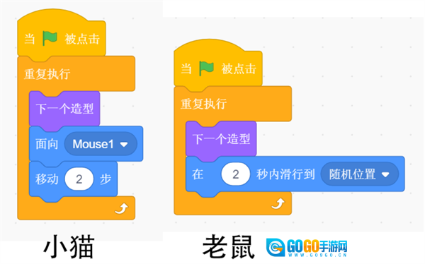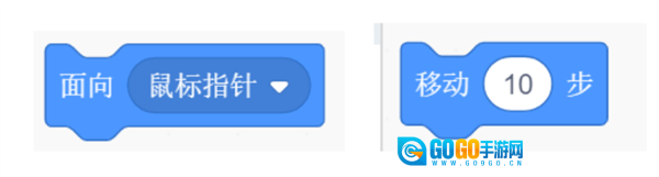 怎样达成猫捉老鼠的功能呢?能够借助运动模块里的这两个模块来实现。