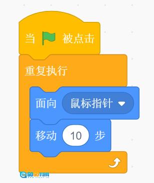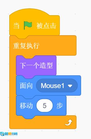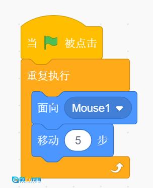 2、要是你觉得让老鼠移动还得依靠鼠标指针太过繁琐,我们能够对编程代码进行修改。修改后,老鼠会随机移动,而小猫依旧面向老鼠,修改之后小猫和老鼠各自的编程代码如下: