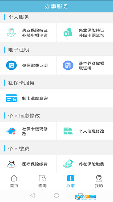 3、点击办事,可以在线办理养老资格待遇认证,个人停续保等业务。