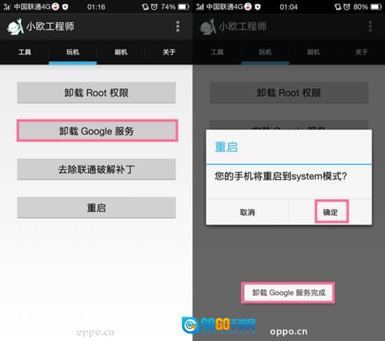 完成Google服务的安装后,玩机选项会变为【卸载Google服务】,在此选项下点击【卸载Google服务】,待提示卸载Google服务完成,重启手机就可以了。