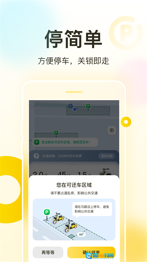 4. 结束骑行流程:抵达目的地后,把车辆停放在规定的区域,随后结束骑行,完成支付操作便完成整个流程。