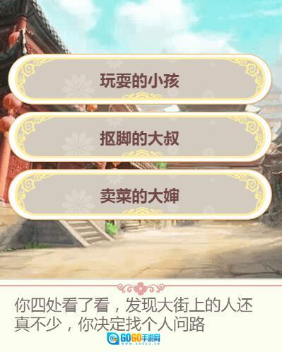 2、大叔:而且还是抠脚大叔,光看外表就觉得不是什么好人。要知道在古代,人贩子多得很,一个弱女子身处那样的环境里,危险系数极高。这个选项堪称最危险的选择,实际上,一旦选了这个选项,游戏便会直接结束,主角将会被拐卖。