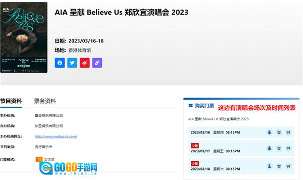 登录账号后,页面会跳转至首页,可以开始你的购票旅程了,选择你需要购票的节目。这里以《AIA 呈献 Believe Us 郑欣宜演唱会2025》为例。进入具体页面之后,会在右边显示节目时间表及门票剩余情况。