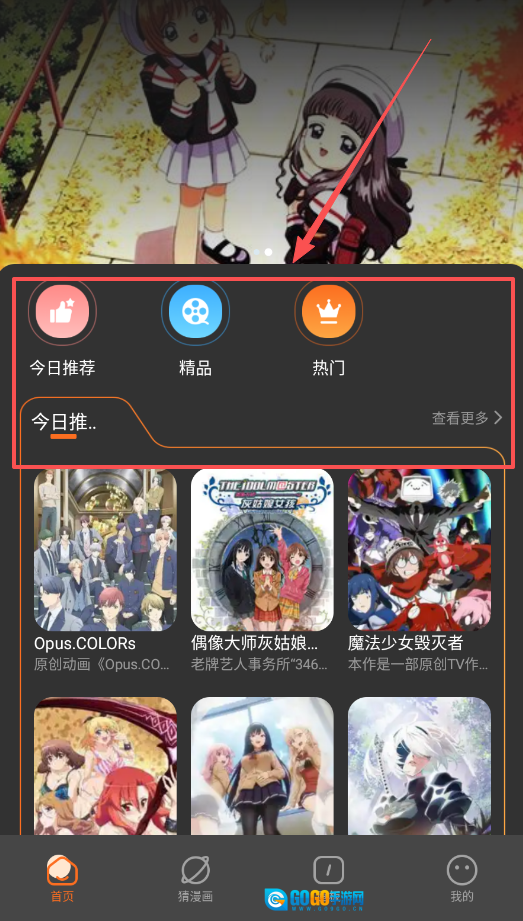 2、回到首页,该页面设有今日推荐、精品以及热门这三个板块,通过滑动屏幕,能够看到诸如魔法少女毁灭者等各类不同的动漫推荐。