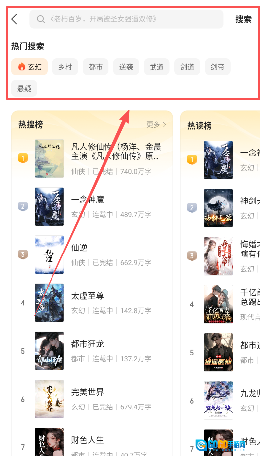 3、要是你想找寻特定的小说,可点击顶部的搜索图标,于搜索框内输入书名、笔名或者关键词,此时系统便会展示热门搜索以及历史记录。