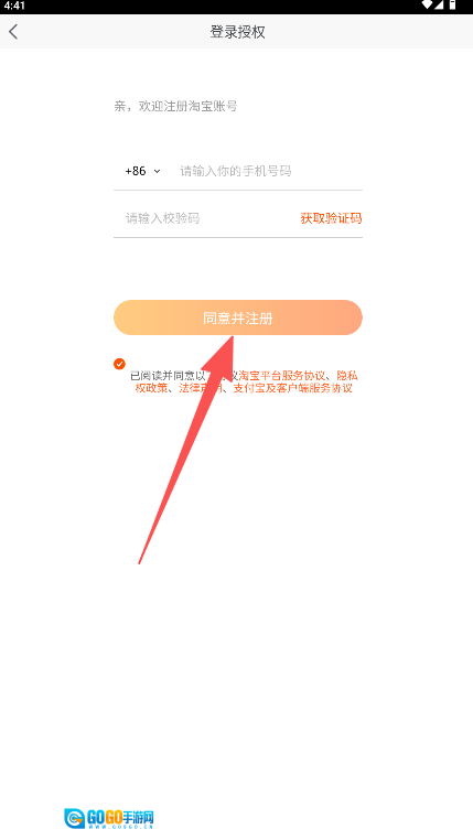 1、在输入手机号与验证码,同时勾选协议之后,点击“同意并注册”按钮。
