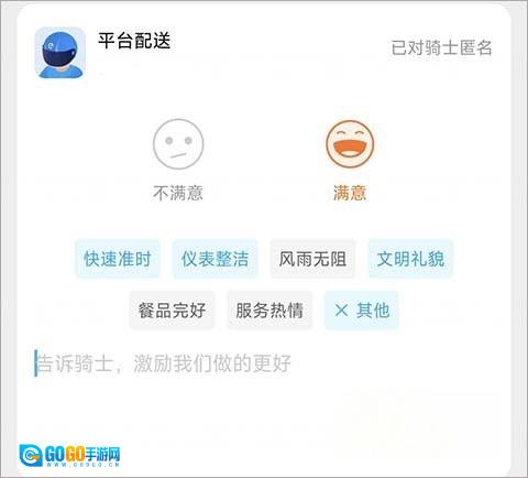 3、选中“速度快”“态度好”这类标签,你还能够写下更详细的表扬内容,例如“送餐准时,态度热忱”,以便让其他用户知晓这位骑手的出色之处。