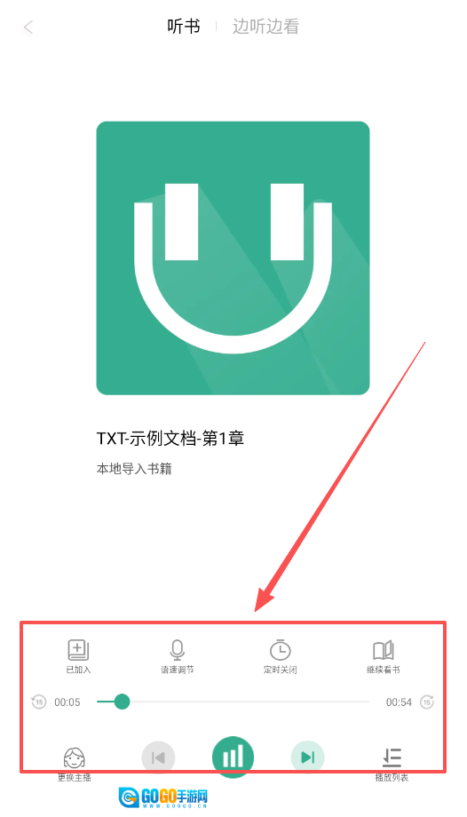 3、文档打开后,进入听书界面,你会看到播放进度、定时关闭等实用按钮,同时你的听书记录会保存在播放列表中。