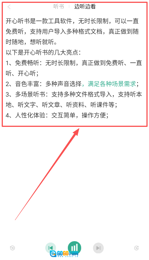 1、开心听书用户无需额外操作,就能直接在线收听数万本有声读物,随时随地畅享聆听。