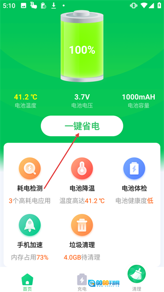 1. 在电池优化的首页,点击【一键省电】按钮,随即进入耗电检测流程。