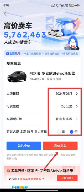 4、填入【上牌日期】、【行驶里程】等车辆相关信息,确认准确无误后,点击【高价卖车】,即可提交卖车申请。