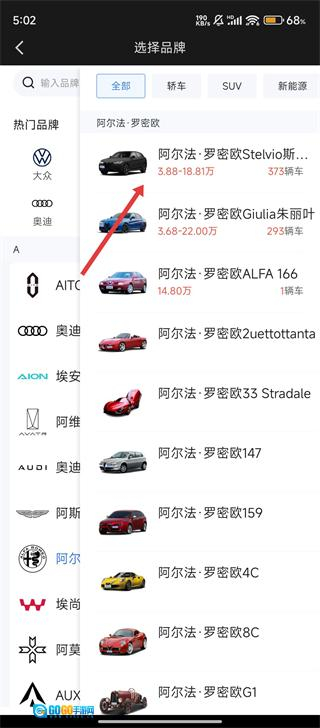 2、于品牌选择页面,寻觅并点击欲售卖车辆的品牌,例如【阿尔法-罗密欧Stelvio斯坦维】。
