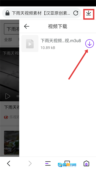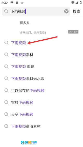 1. 开启微米浏览器,于搜索框中输入【下雨视频】,并选取相应的搜索建议。