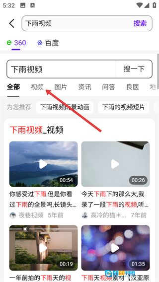 2、进入搜索结果页面后,点击【视频】标签,这样就能筛选出与下雨相关的视频内容,查找目标视频会更便捷哦。