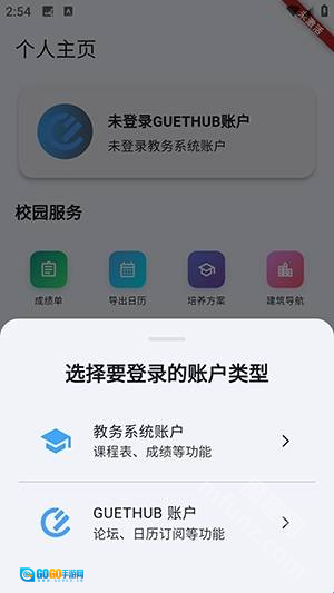 2、挑选账号类型,可选择教务账户或GUETHUB账户,二者选其一。