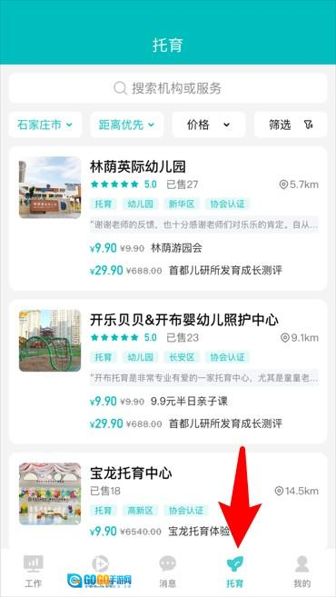 5、托育栏目涵盖幼儿园与照护机构相关信息,通过距离、价格等条件筛选,助力用户便捷查找。