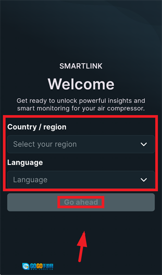 开启Atlas Copco SMARTLINK ,首先挑选国家/地区、语言,接着点击继续。