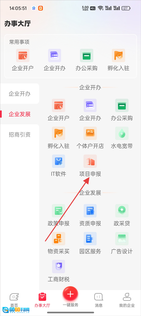 2. 在办事大厅页面里找寻并点击【项目申报】,从而启动申报流程。