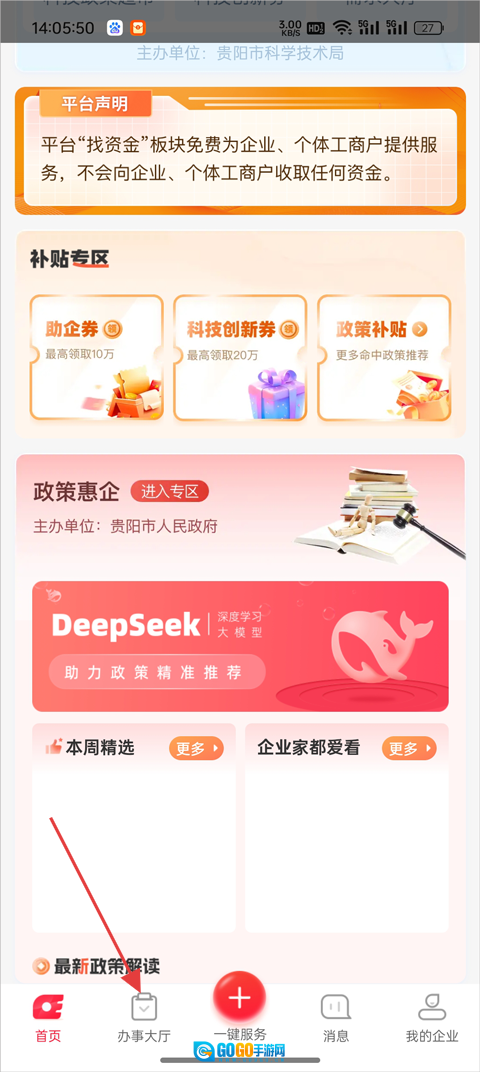 1. 开启贵商易App,待进入首页,点击底部导航栏里的【办事大厅】,从而进入业务办理区域。