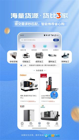 淘备备作为聚焦机械设备交易的专业平台,核心提供一站式便捷买卖服务。凭借首付仅需一成起的低门槛特性,打破资金阻碍,助力更多创业者与企业轻松获取所需设备。平台整合了AI智能匹配、全品类设备展示、安全交易保障以及物流售后协同等诸多功能,涵盖35大类通用机械设备。通过简化交易流程,有效降低沟通与资金成本,成为连接供需双方、提升行业流转效率的优质交易平台。