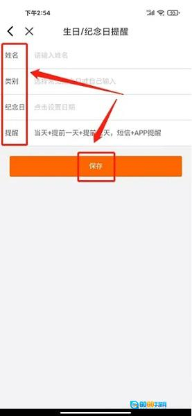 打开生日或纪念日提醒页面,依次填入姓名、类别、纪念日以及提醒内容,最后点击【保存】按钮。