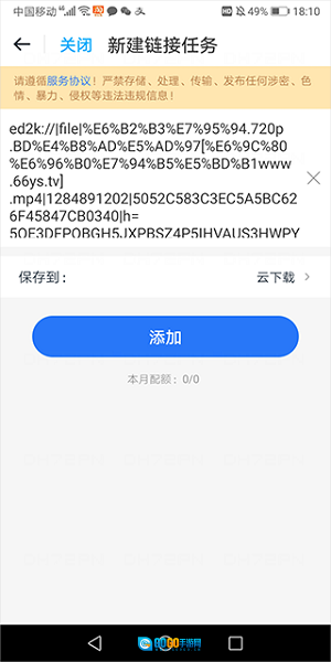 3、接下来输入链接地址,支持直链、磁力(也就是bt文件链接的新形式)以及电驴链接(一种比bt出现更早的方式),例如在下图中就输入了一条磁力链接。