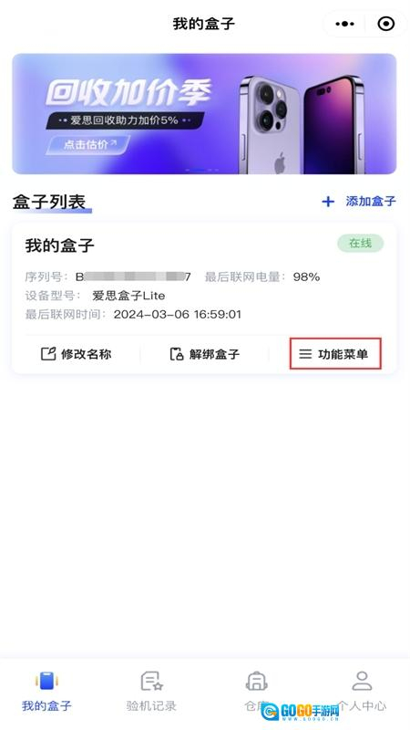 1. 使用数据线把iPhone和爱思盒子Lite相连,在微信小程序里搜索并打开“爱思验机”,依照添加盒子教程,把盒子添加进“我的盒子”列表,如此就能在功能菜单中运用“一键越狱”功能。