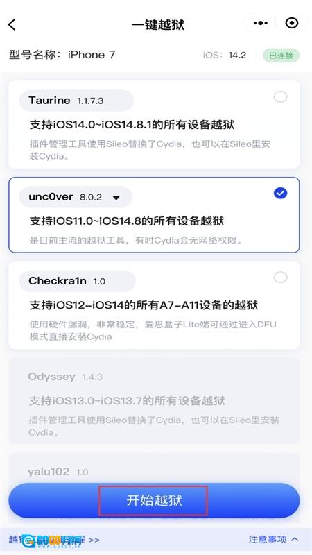 2、开启一键越狱功能,挑选支持的越狱工具(能勾选的即为支持当前设备的越狱工具),接着点击“开始越狱”。