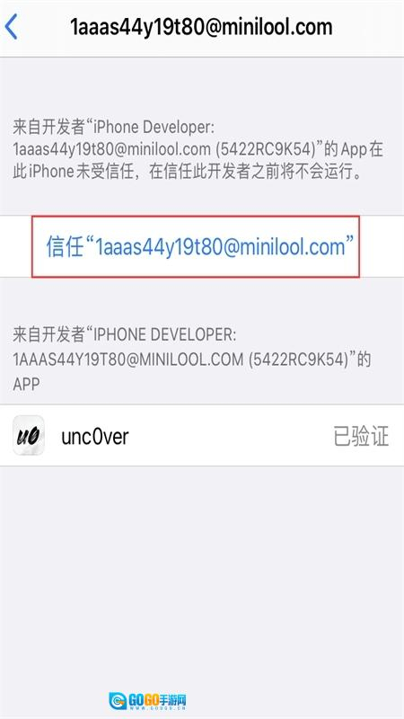 4、按照提示,前往iPhone设置中的通用选项,找到设备管理,对已安装的文件进行信任操作。完成后,在iPhone桌面打开越狱应用,即可开始越狱。