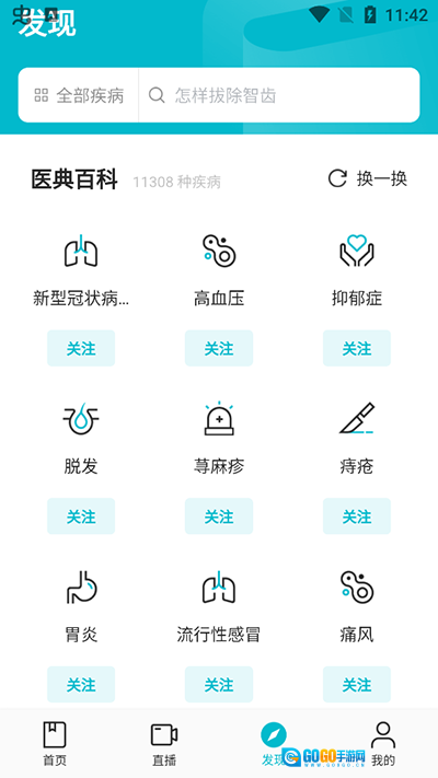 3、点击底部“发现”,医典百科收录了上万种医学疾病查询内容。