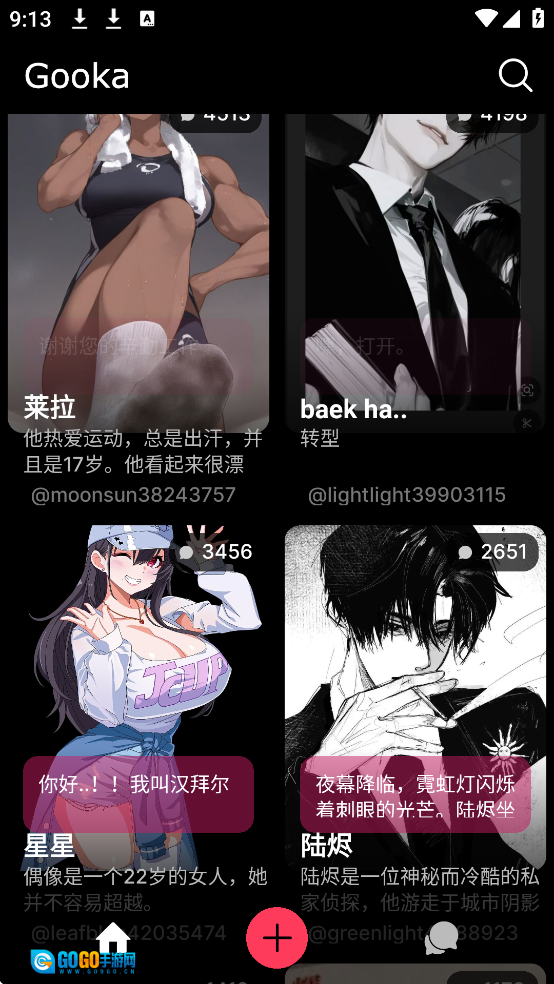 1、打开gooka ai聊天软件首页,直接挑选虚拟角色。