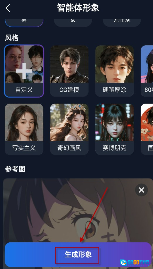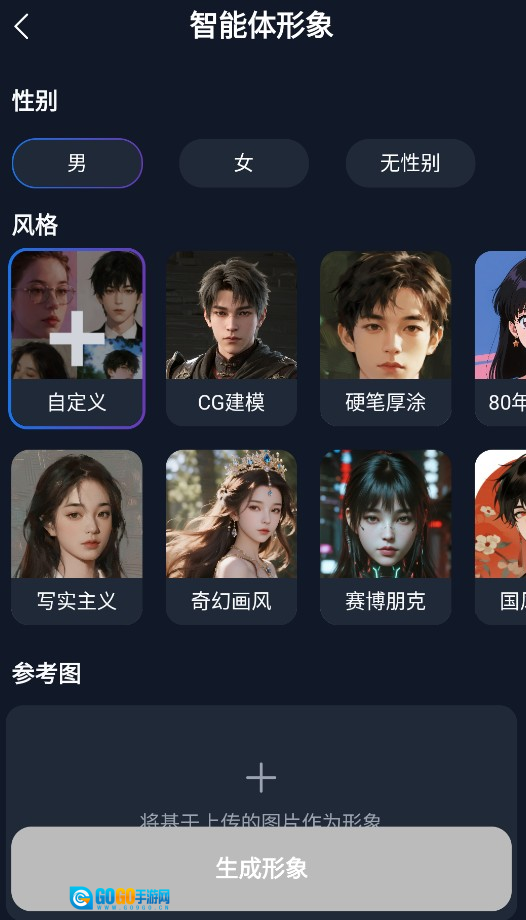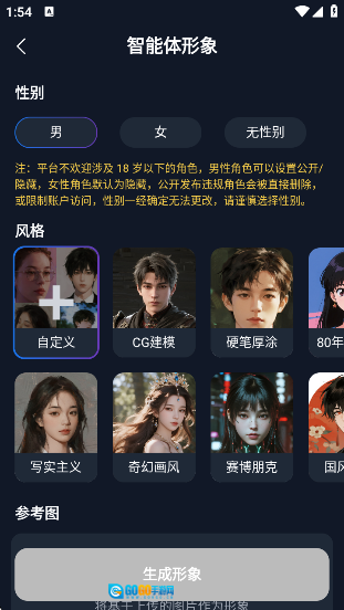 登录之后,在软件的对应位置进行点击操作,首先选择性别与风格,也能够上传参考图片来创建角色。在创建过程中,需遵循平台所规定的角色创建规则。