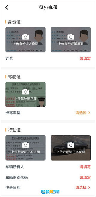 2、进入软件后,需补齐信息方可接单,按照平台要求上传身份证、驾驶证、行驶证等各类信息照片。