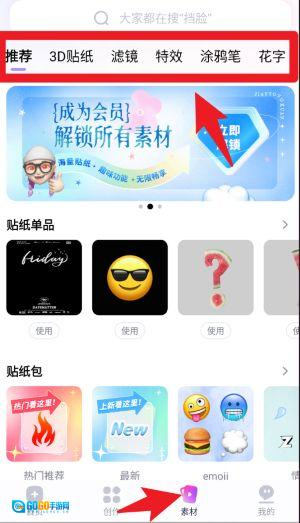 3、进入“素材”页面,即可浏览并使用贴纸、滤镜、涂鸦笔等各类素材。会员用户能够一键解锁全部资源。