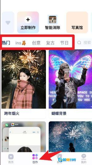 2、进入“创作”页面,挑选诸如“跨年烟火”“蝴蝶背景”这类热门模板,点击所选模板后,上传照片就能自动完成合成。