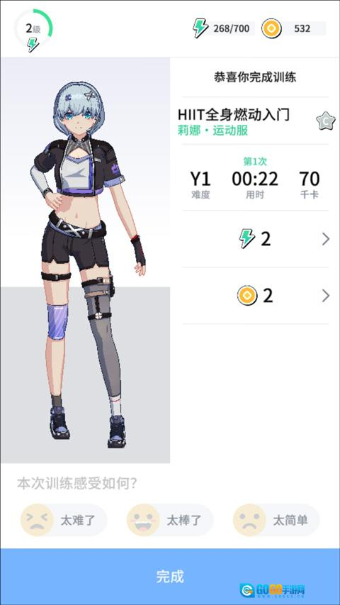 8、训练结束后,教练会夸赞你“你真棒”。这时,你还能查看此次训练所消耗的时间、训练难度以及消耗大卡的数量。