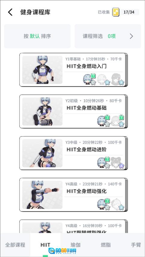 4、点击“健身”,这里的健身课程丰富多样,涵盖全身燃动、瑜伽、燃脂、手臂训练、增肌、塑形、拉伸放松、疾速燃脂以及拳击等。而且,每个课程的难度跨度较大,从适合零基础的y1级别,一直到具有挑战性的y5突破级别。
