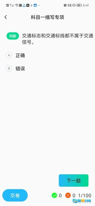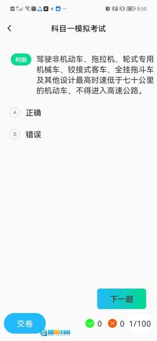 4、科目一模拟考试为用户提供100道题目,用户选择正确答案后即可进入下一题。