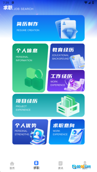 3、于求职页面,能够开展简历制作工作,填写诸如个人信息、教育经历、工作经历、项目经历等各类资源。