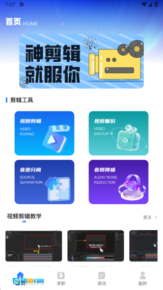 1. 首页设有视频剪辑、视频备份、音源分离及音频降噪功能,还能接触到视频剪辑教学内容。