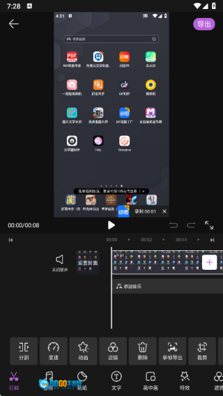 2、轻点视频剪辑功能,挑选视频,进而运用各种剪辑、音频、贴纸、文字以及画中画等功能。