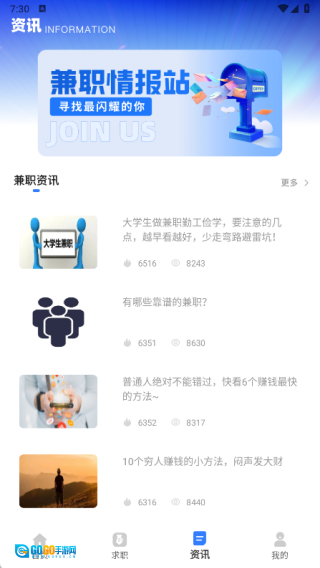 4、在资讯页面,能够知晓各类兼职资讯,及时掌握各类资讯详情。