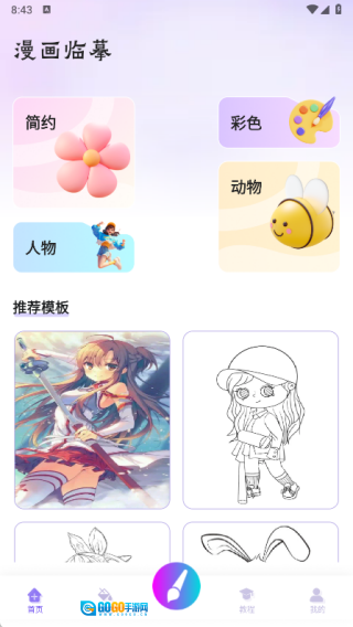 1、首页提供简约、彩色、人物及动物相关内容,同时可了解推荐模板信息。