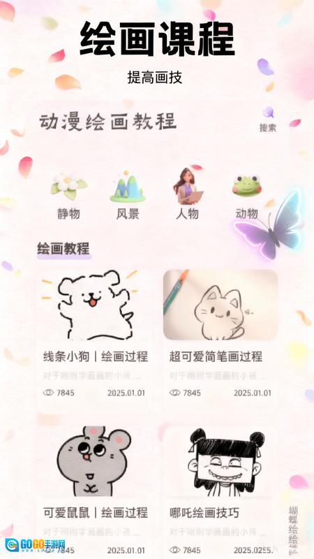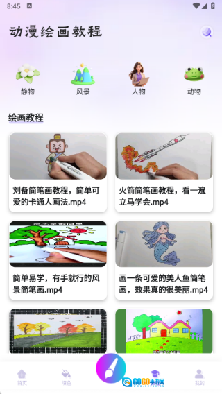 4、教程页面设有静物、风景、人物、动物等分类,可及时知晓绘画教程相关内容。