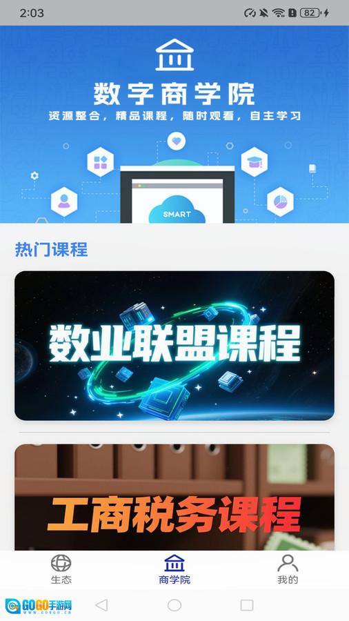 1. 数字商学院推出精品课程,涵盖热门的数业联盟课程、工商税务课程等,用户能够随时观看并学习。