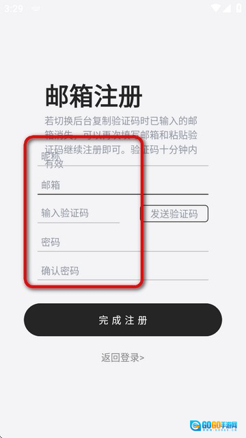 2、需要输入昵称,邮箱及验证码和两次密码。